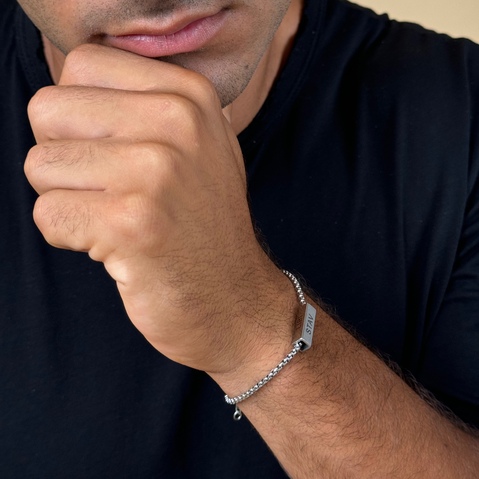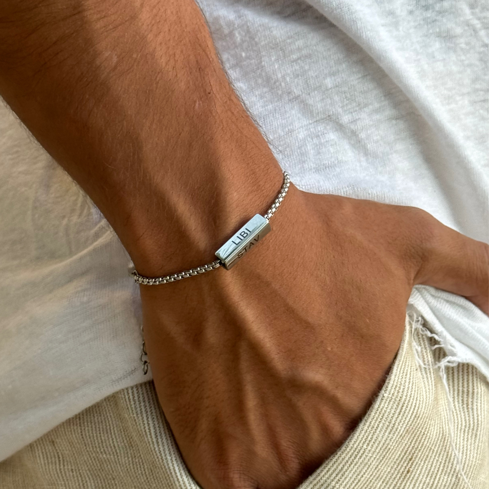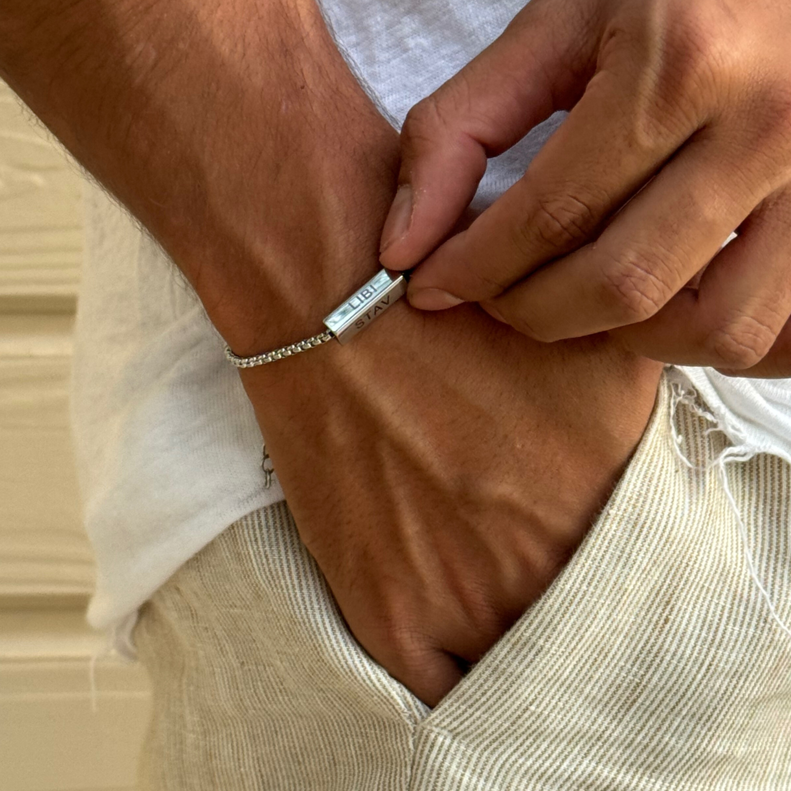 צמיד קלאסי ומהמם לגבר המשלב תליון עם אפשרות חריטה ב 4 צדדים שונים .